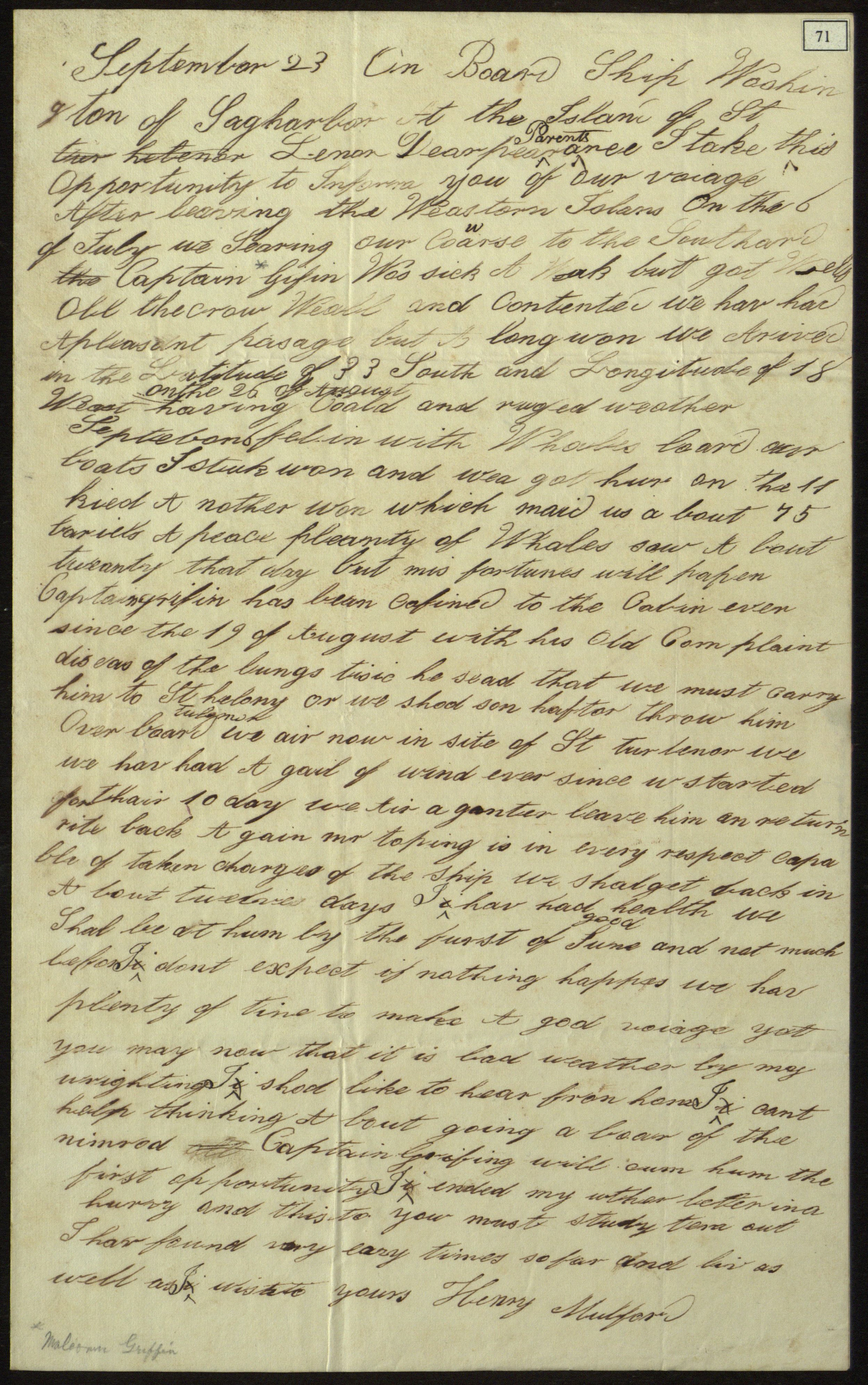 Letter from Henry Mulford, onboard whaling ship Washington, to father Jonathan Mulford Jr., in East Hampton Township, N.Y., Saint Helena, September 23, 1835. Letter relates details of their voyage, particularly the severe illness of Captain [Maloomer Griffin?].