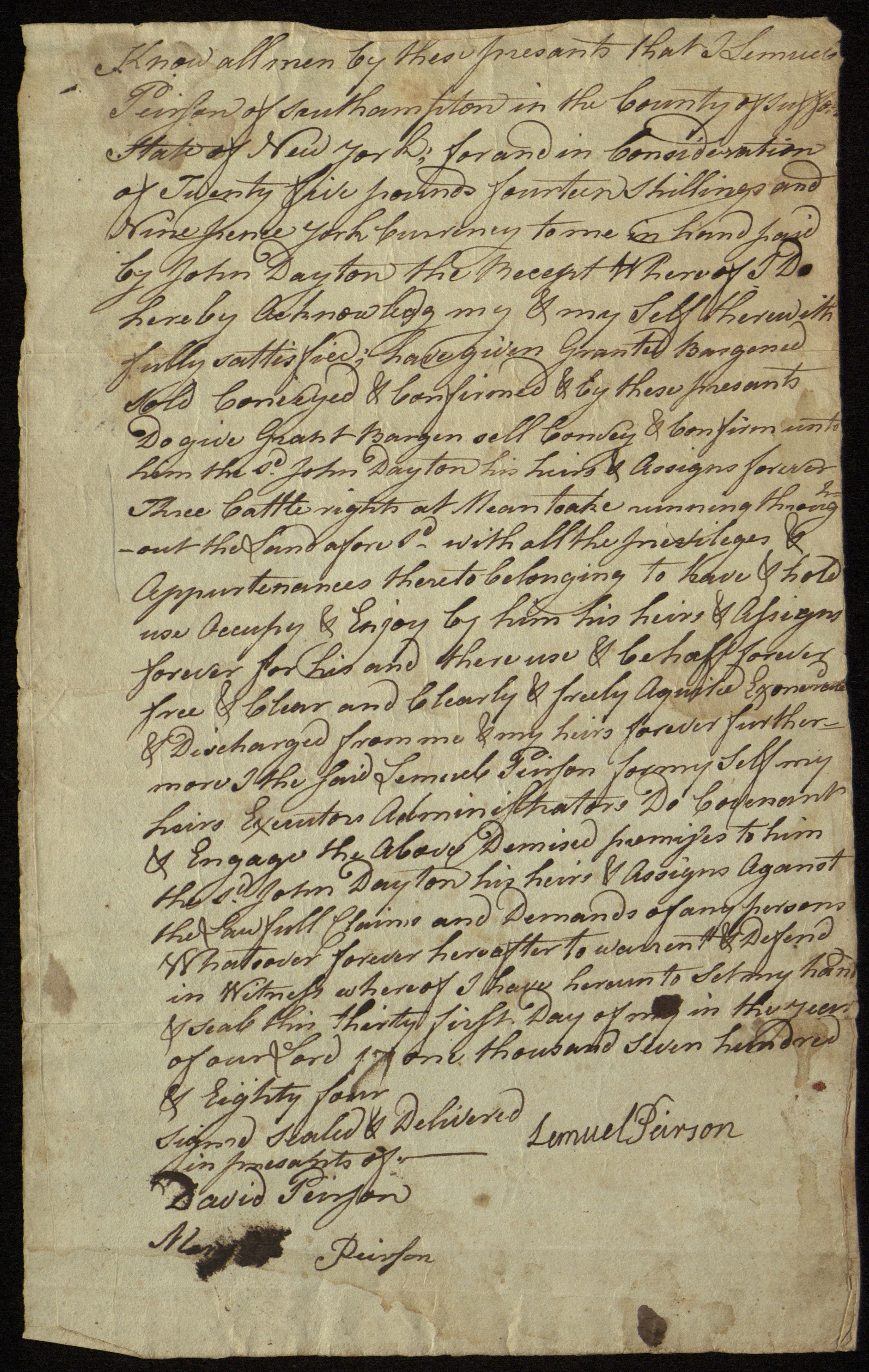Deed from Lemuel Peirson to John Dayton for “three cattle rights at [Montauk],” dated 1784