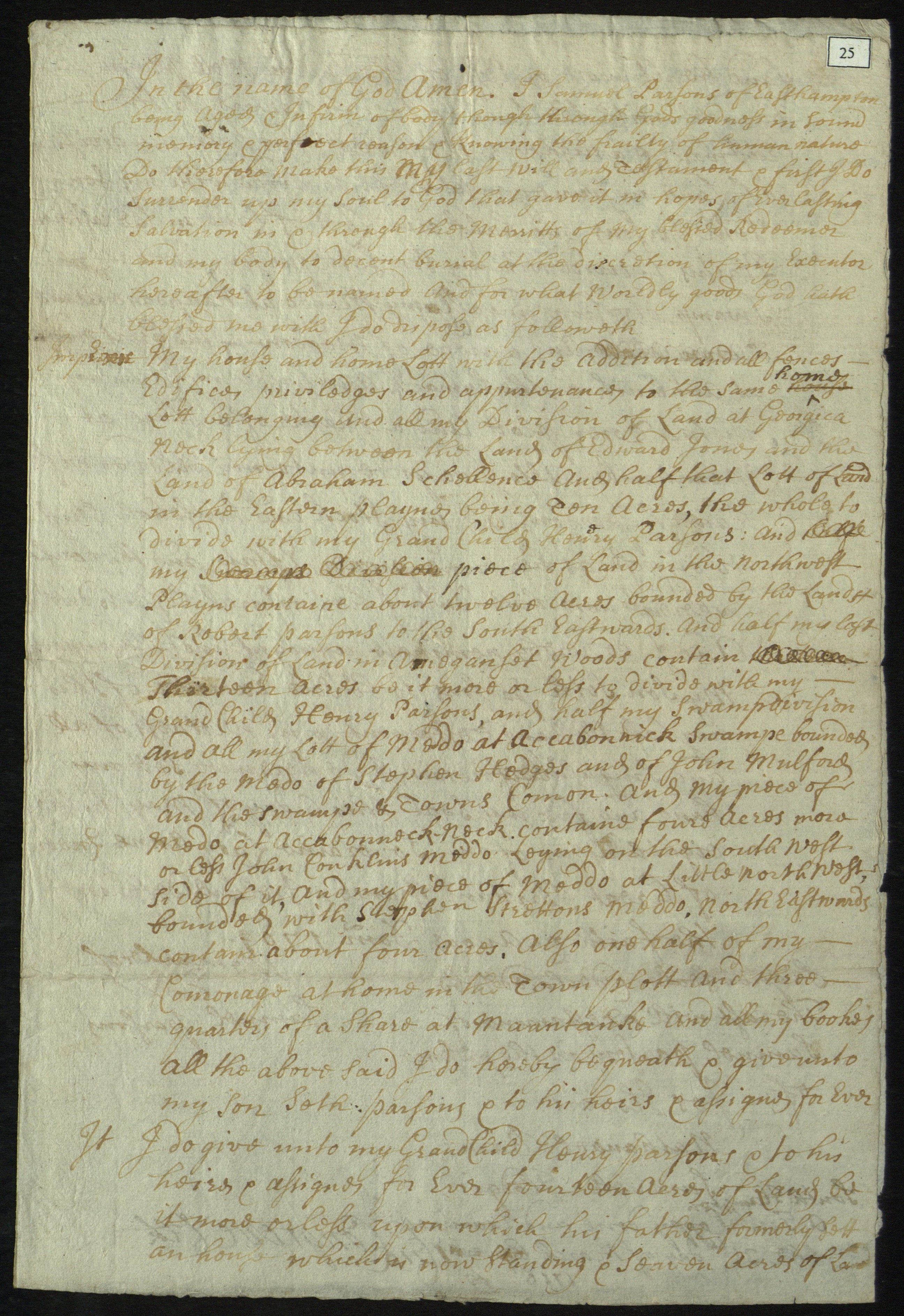 Certified copy of last will and testament of Samuel Parsons, of East Hampton Township, N.Y., originally dated May 6, 1709; March 29, 1716. Bequathments of lands throughout East Hampton Township, N.Y., including Montauk, to wife Hannah Parsons, son Seth Parsons, and grandson Henry Parsons; executed by son Seth Parsons, witnessed by Josiah Hobart, Samuel Hedges, Nathaniel Barns. True copy made, examined, and proved in Suffolk County, N.Y. Court of Common Pleas, held at Southampton, N.Y., by court clerk C. Congreve on March 29, 1716.